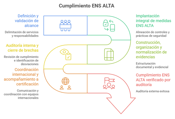 Objetivo: preparar a la empresa para cumplir el Esquema Nacional de Seguridad (ENS) en categoría ALTA para servicios de desarrollo, asegurando documentación y evidencias completas, y coordinando el cumplimiento con equipos internacionales, de forma que la organización estuviera lista para afrontar la auditoría con garantías.